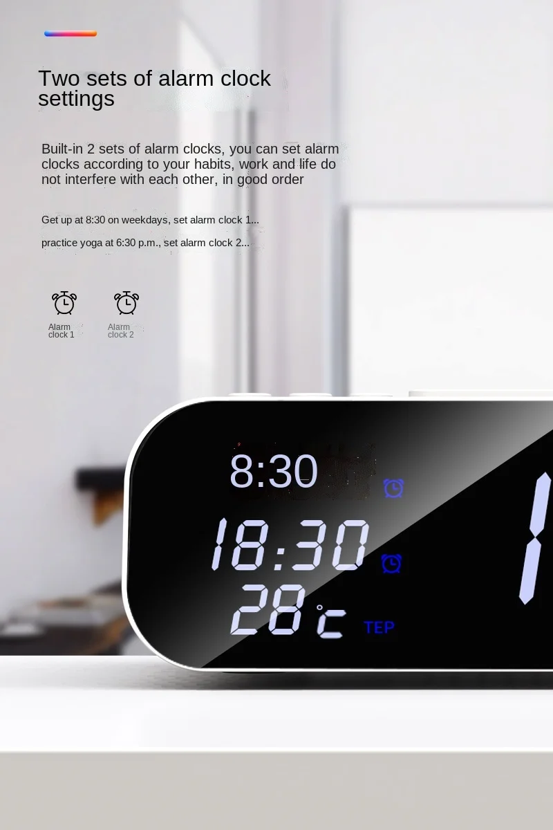 2. Set the alarm: Press and hold Alarm 1 for 2 seconds to enter the setting of Alarm 1. The initial alarm time is 8:00. After setting the alarm clock, press the "Alarm Clock 1" button to set the alarm minutes. After setting the same clock 1, press the "Network clock 2" button to set the alarm clock 2(the setting procedure is the same as that of alarm clock 1). After setting, simply press the snooze button for 2 seconds or automatically exit the clock setting mode with no operation for 10 seconds.